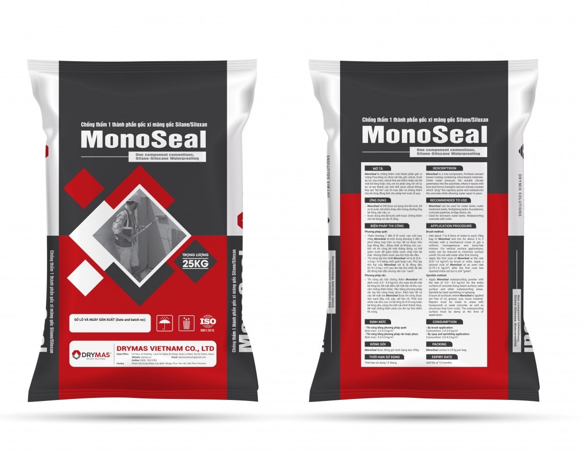 MonoSeal là chống thấm một thành phần (chỉ thêm nước), gốc xi măng Pooclăng có chứa vật liệu gốc silicat. Dưới áp lực của nước, silicat hòa tan thâm nhập vào bề mặt bê tông hoặc vữa, nơi nó phản ứng với vôi tự do và tạo thành các tinh thể canxi silicat không hòa tan “bịt kín” các lỗ mao dẫn và chống thấm cho bê tông đồng thời cho phép hơi nước đi qua.
