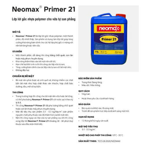 Neomax® Primer 21 là lớp lót gốc nhựa polymer, một thành phần, độ nhớt thấp. Sản phẩm sử dụng làm lớp lót giúp tăng cường khả năng bám dính cho các hệ lớp phủ gốc xi măng với nền bê tông hoặc nền vữa.