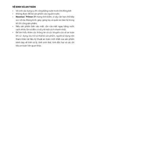- Neomax® Primer 21 mang tính kiềm, vì vậy cần hạn chế tiếp xúc với da. Mang kính, giày, găng tay và quần áo bảo hộ trong khi thi công sản phẩm;