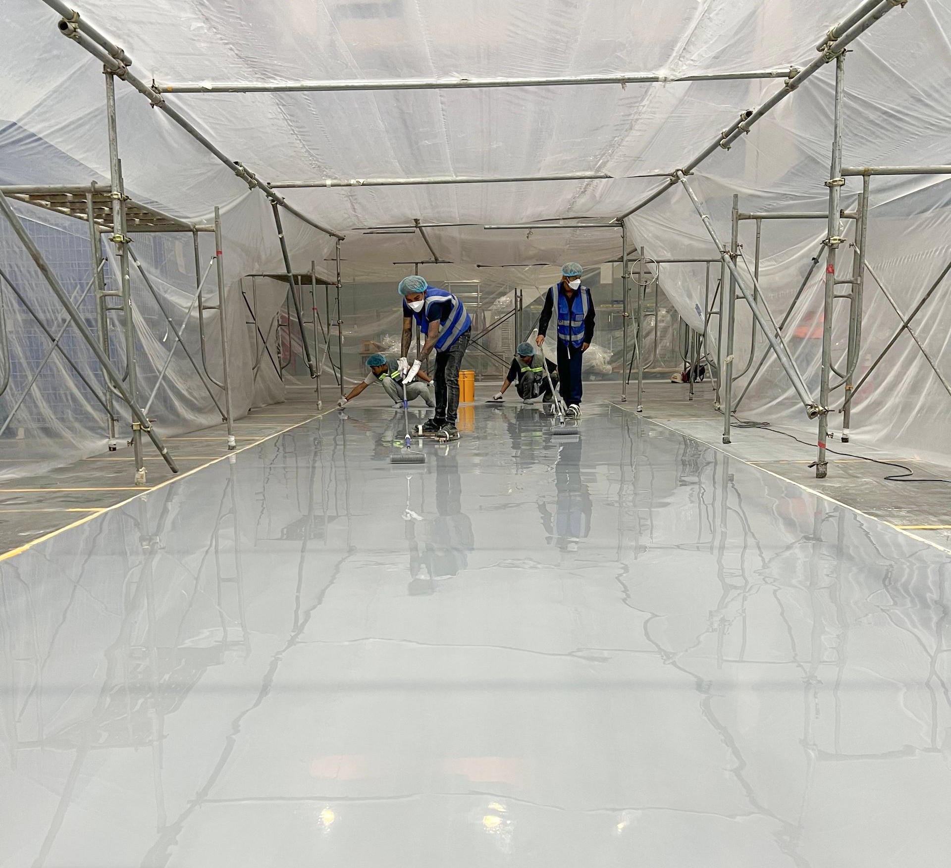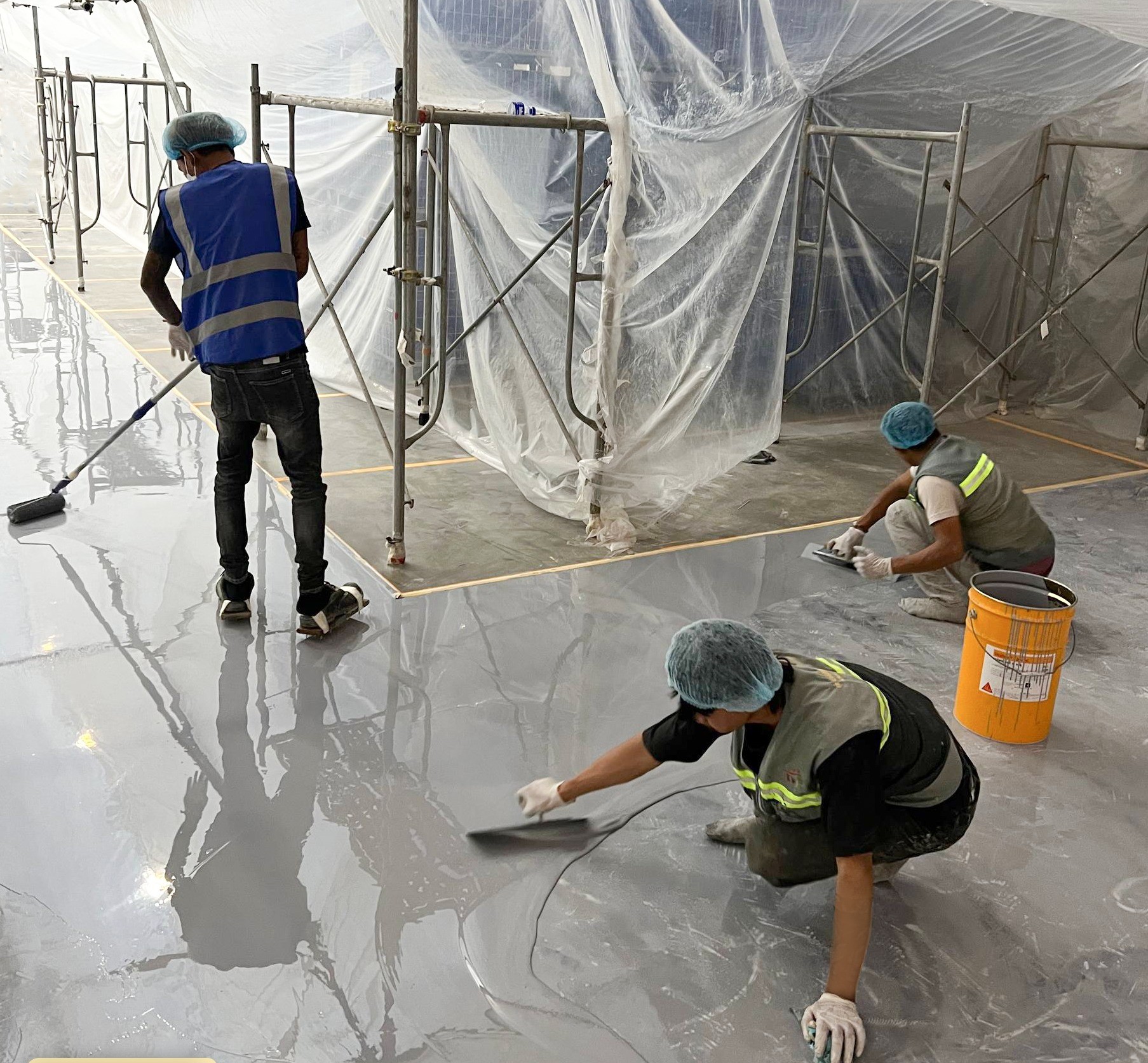 - Sau đó, thi công Sikafloor 264 bằng con lăn dầu cho lớp phủ và thanh gạt cao su cho lớp trám.